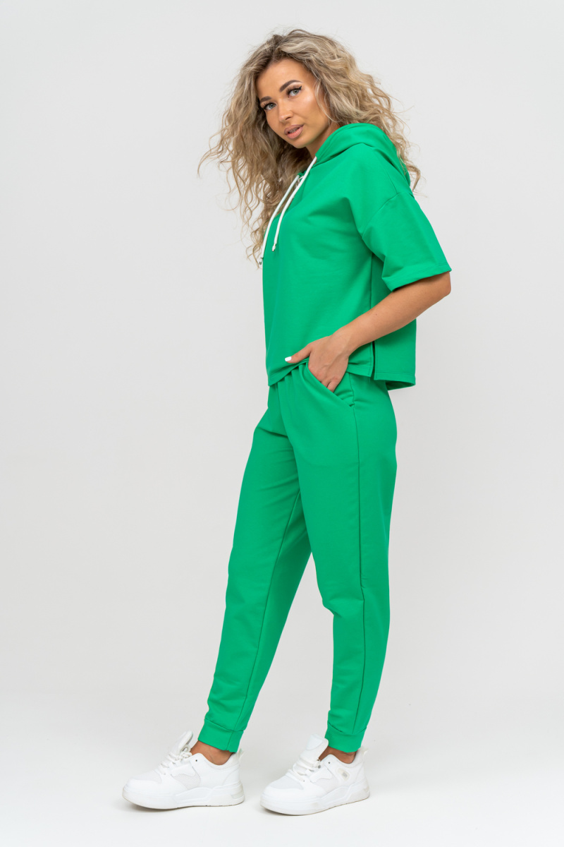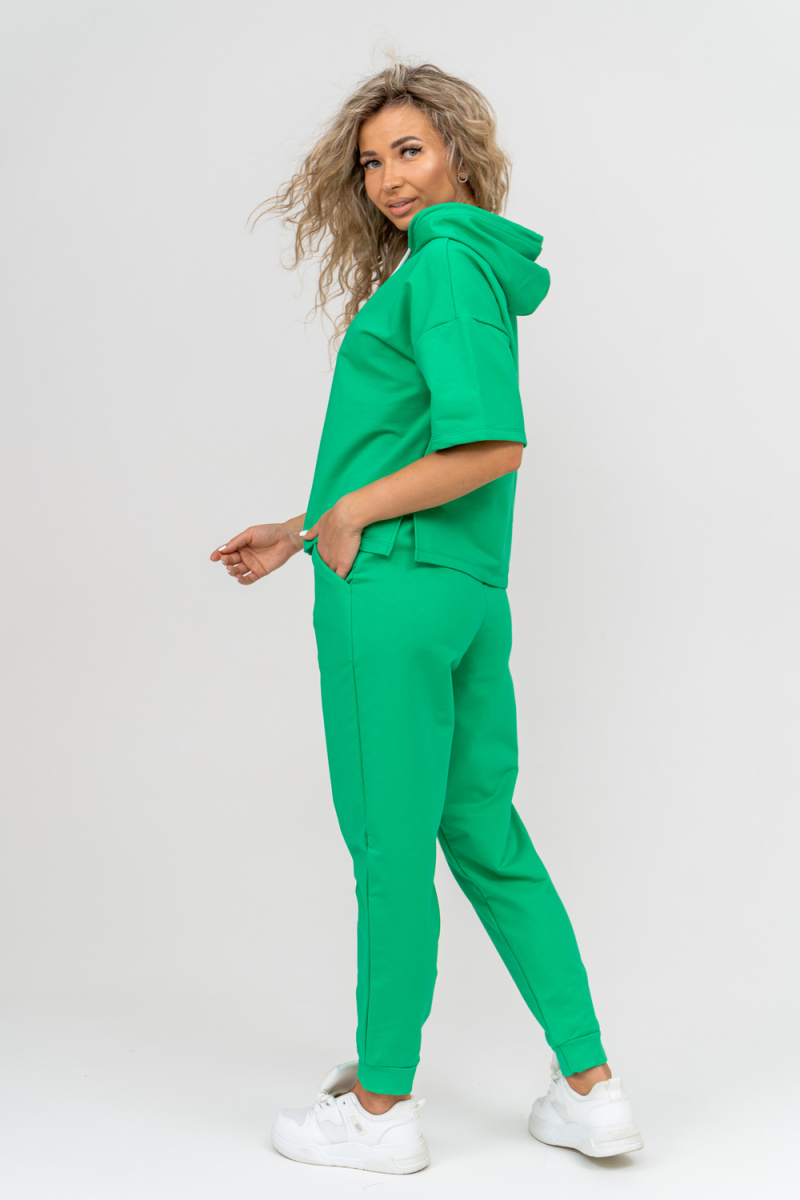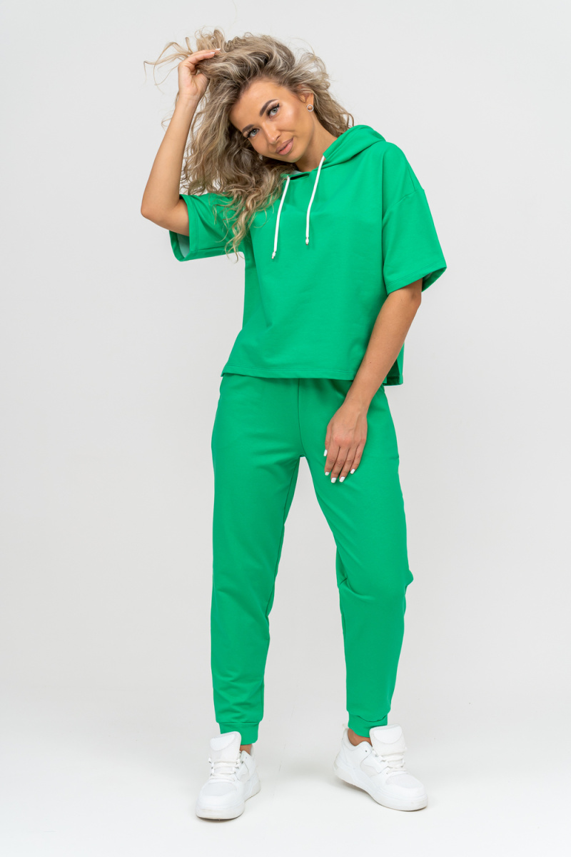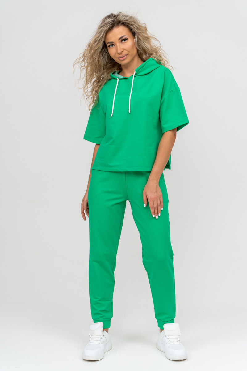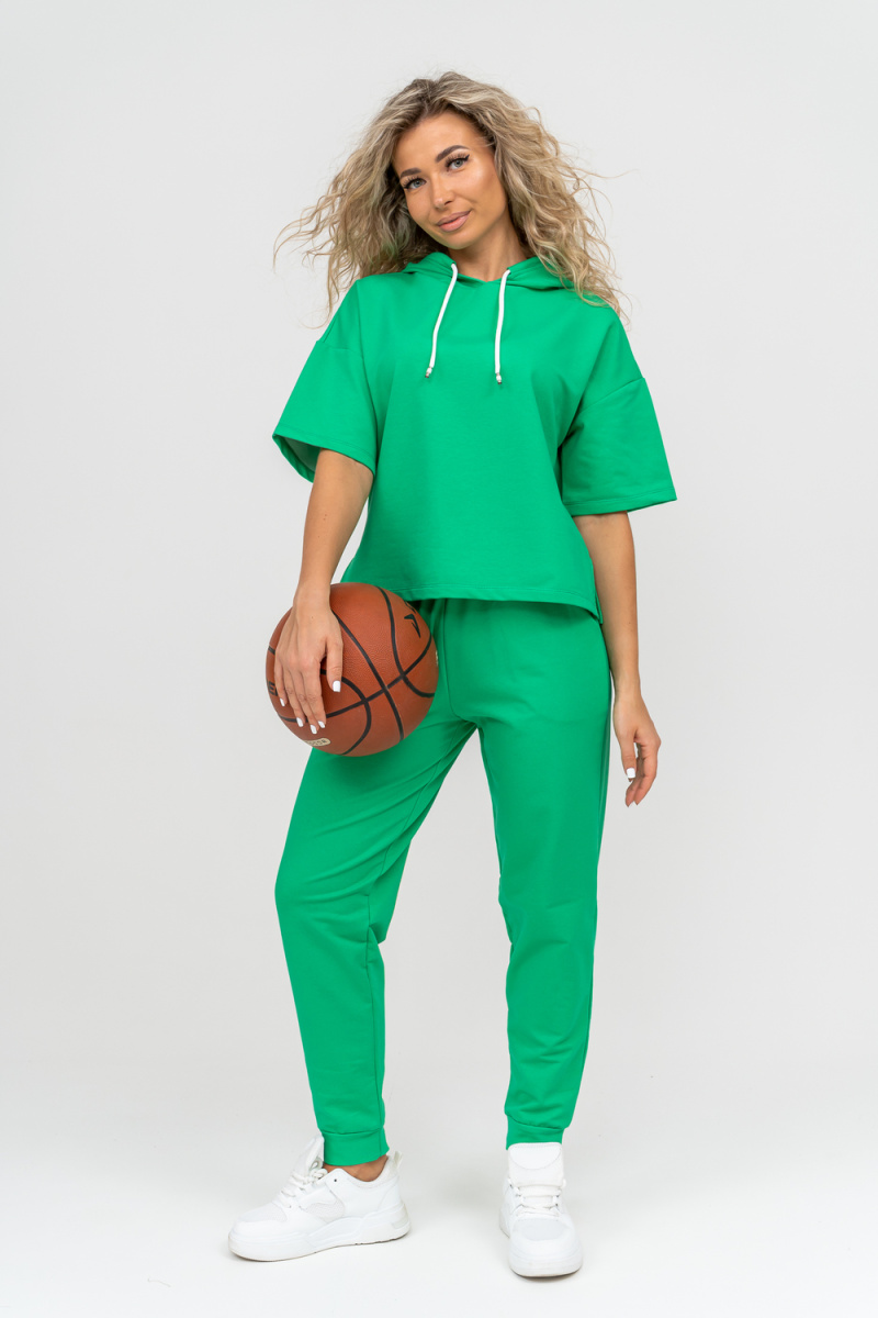 Женский костюм выполнен из футера высокого качества с хлопком и небольшим добавлением полиэстера и лайкры, что позволяет изделию не скатываться и оставлять идеальный внешний вид на долгое время. Костюм состоит из толстовки и брюк. Толстовка с капюшоном и шнурком. Линия плеча спущена, рукав укороченный, по бокам имеются небольшие разрезы. Брюки представленны с вместительными боковыми карманами. Манжеты брюк выполнены из основного материала, а пояс на специализированной поясной машине, что делает швы ровными и качественными. Свободный крой прекрасно будет смотреться на дамах с любыми формами. Костюм такого плана представлен в широкой размерной сетке, что позволяет выбрать его как девушке, так и женщине. Однотонный костюм модных расцветок будет удачным выбором для поездок в отпуск, на пикник, для школы, для активного отдыха и прогулок по городу. Будет гармонично сочетаться как с кроссовками, так и с туфлями, балетками или босоножками. Используя эту модель в качестве домашнего костюма, Вы поймёте, что это именно