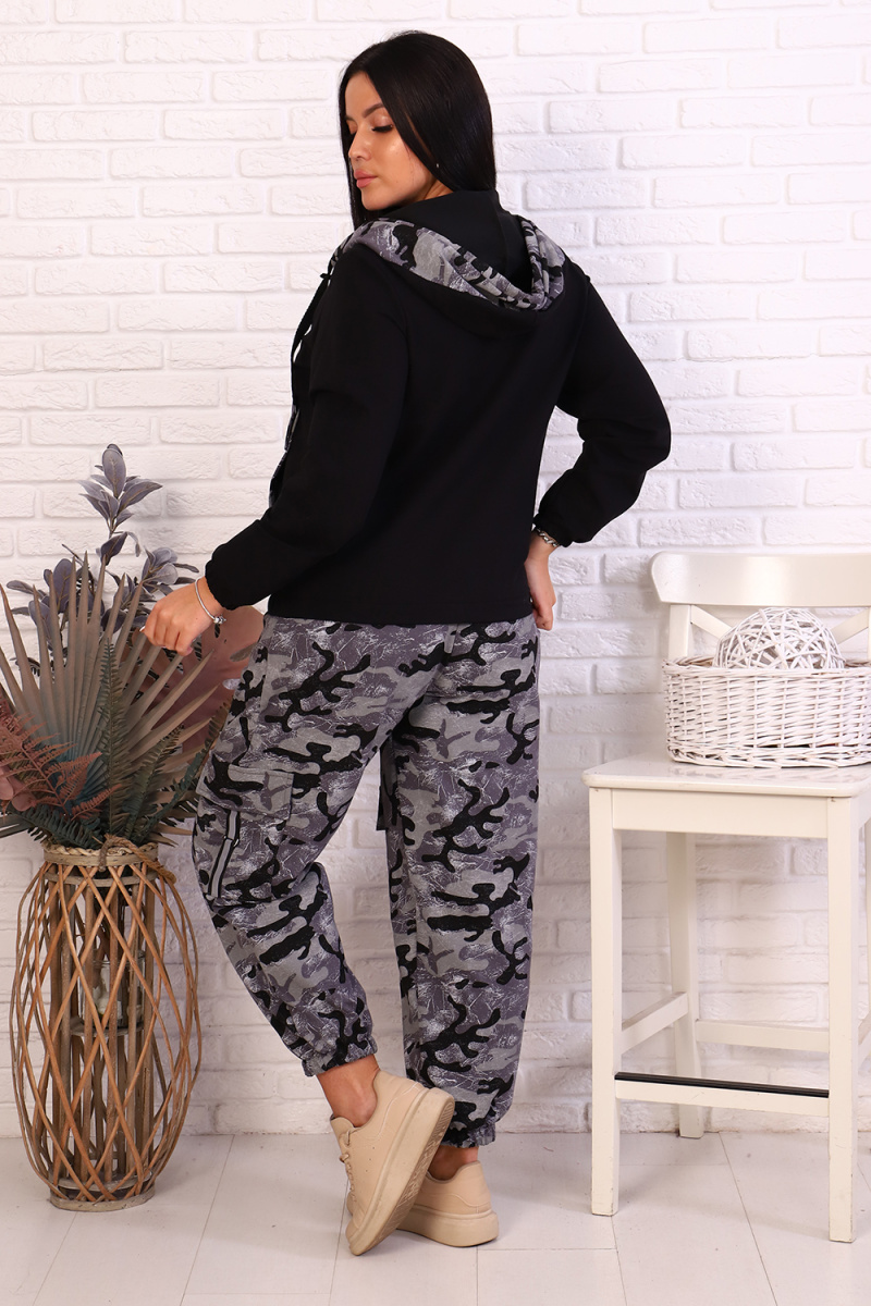 Женский костюм, выполненный из приятного к телу камуфляжного футера, состоит из толстовки и брюк. Толстовку оттенка хаки дополняет капюшон с плоским черным шнуром и тракторная молния, которая несет, как декоративную, так и функциональную роль. Низ и рукав изделия на резинке, спереди имеется удобный накладной вместительный карман с клапаном. Брюки свободные на резинке с боковыми и накладными карманами с клапанами. Костюм декорирован светоотражающими лентами и полукольцами. Комфорт, удобство и безопасность - основные функции костюма. Брюки можно приобрести отдельно - модель 6326